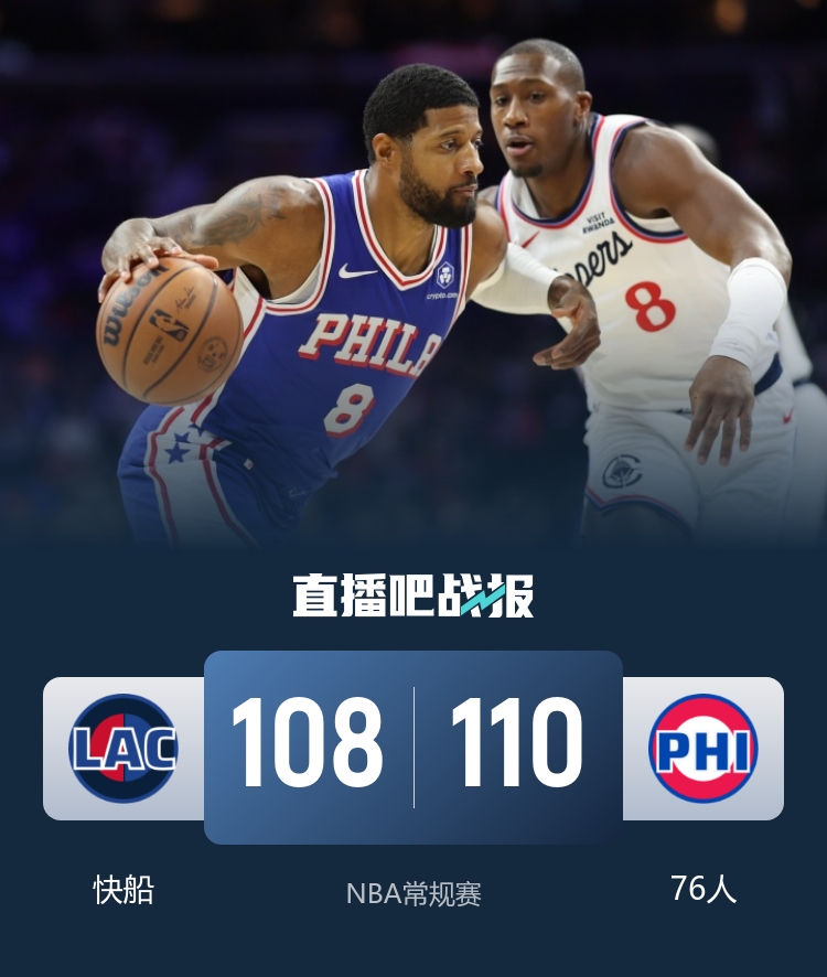 76人(8-5):马克西39分3板6助、格莱姆斯19分2板3助2帽、德拉蒙德14分18板、埃奇库姆14分6板6助、乔治9分7板3助2帽、沃特福德8分4板4助、巴洛7分1板3断、爱德华兹5板4助